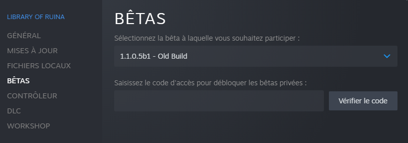 Once the game is downloaded, go to the steam settings of the game, then to the Beta tab. Finally, change the game version to "1.1.0.5b1 - Old Build", like this :